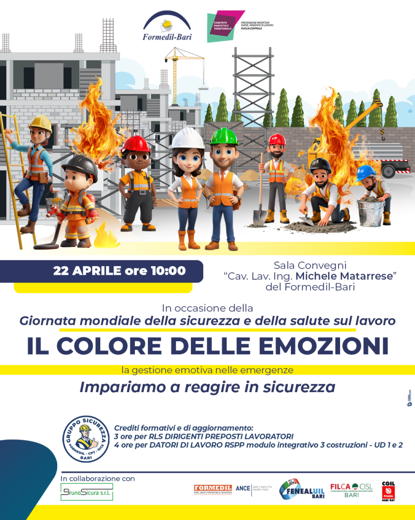 Il 22 aprile alle ore 10:00 ti aspettiamo al Formedil-Bari per un evento dedicato alla Giornata mondiale della sicurezza e della salute sul lavoro. IL COLORE DELLE EMOZIONI La gestione emotiva nelle emergenze: impariamo a reagire in sicurezza.