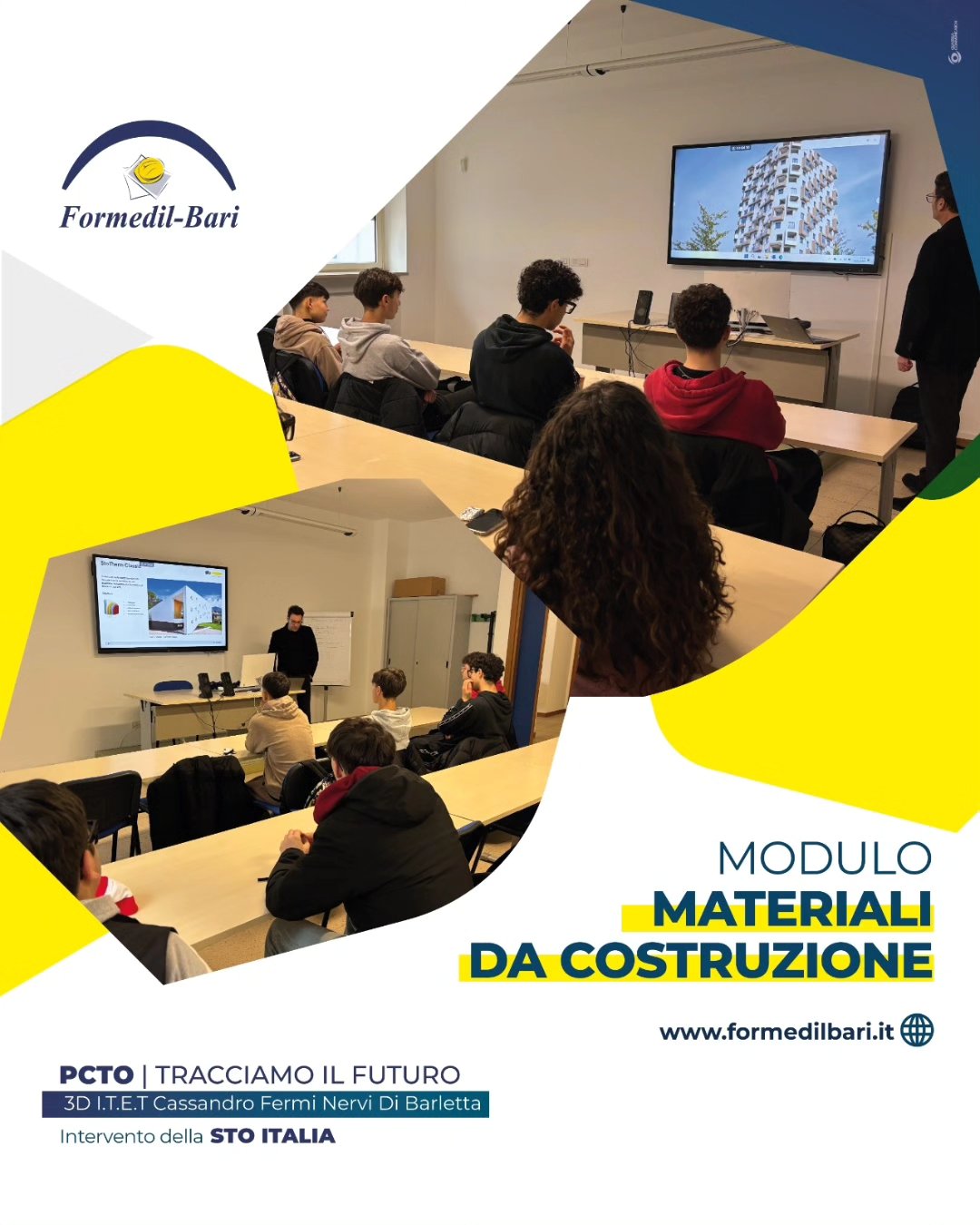 Il laboratorio sui materiali da costruzione, relativo alle attività formative previste dal programma formativo “FSL – Tracciamo il Futuro”, rivolto ai futuri geometri, ha visto la partecipazione attiva degli studenti della classe 3^D dell’ITET Cassandro-Fermi-Nervi di Barletta, che hanno potuto confrontarsi con il mondo dell’impresa grazie all’intervento di Savino Tesoro Project Manager di Sto Italia Sto Italia