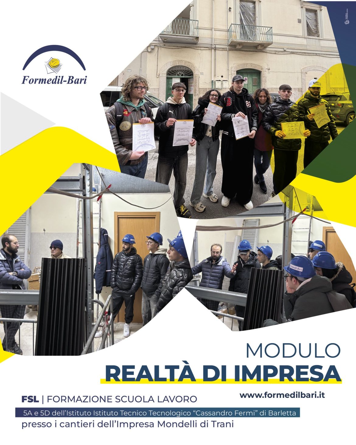 Nell’ambito del progetto Formazione Scuola Lavoro – FSL “Tracciamo il Futuro” Modulo Realtà d’Impresa, promosso da Formedil Bari, prosegue con successo, il modulo innovativo e unico, introdotto per la prima volta quest’anno, che porta la formazione direttamente in cantiere grazie al prezioso supporto di Imprenditori e Tecnici esperti. I ragazzi delle classi 5^A e 5^D